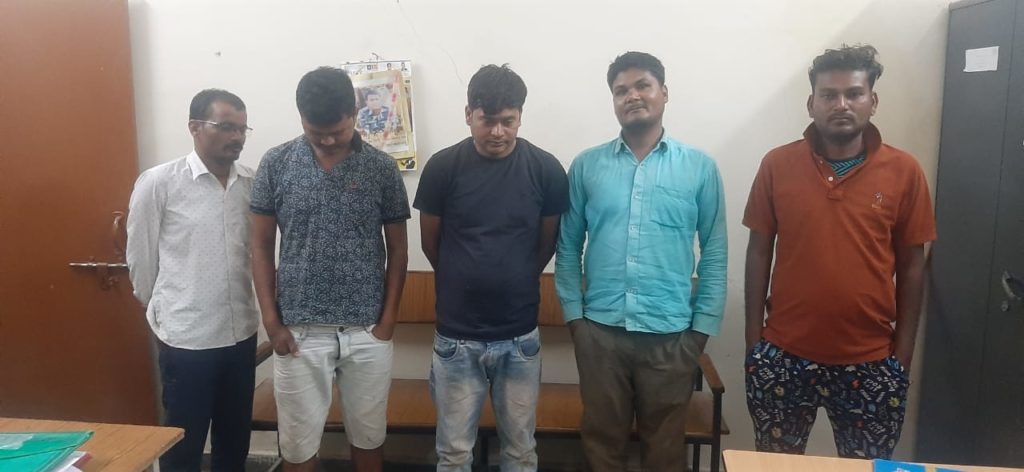 पुलिस अधीक्षक महोदय श्री संतोष सिंह एवं संजय महोदवा के मार्गदर्शन एवं अनुविभागीय अधिकारी पुलिस श्री दिनेश सिन्हा के निर्देशन में क्षेत्र मे जुआरिया के विरुद्ध निरंतर कार्यवाही के क्रम मे दिनांक 02-03-2022 को थाना प्रधारी थाना निरीक्षक श्री नीलेश पाण्डेय के हमराह पुलिस टीम द्धारा मुखबीर की सूचना पर ग्राम दुल्लापुर मैदान मे दबिस देकर आरोपी 01 चुम्मन वर्मा पिता सुक्रित दास वर्मा उम्र 27 साल साकिन सोनपुरी थाना छुईखदान 02 मोतीराम वर्मा पिता चिन्ताराम वर्मा उम्र 47 साल साकिन भोरमपुर खैरागढ़ 03 महेश सतनामी पिता कुन्ज लाल संतानामी साकिन बाजार अतरिया थाना खैरागढ़ 04 दंेवराज पाल पिता खम्मन पाल उम्र 26 साकिन कुकुरमुड़ा थाना खैरागढ़ 05 तुकाराम वर्मा पिता स्व0 रामकुमार वर्मा उम्र 25 साल साकिन कुकुरमुढ़ा थाना खैरागढ़ जिला राजनंादगांव को हिरासत मे लेकर उनके कब्जे से 26370 रुपये नगद, 52 पत्ति ताश जप्त कर आरोपीगण के विरुद्ध अपराध क्रमांक 133@2022 धारा 13 जुआ एक्ट कायम कर विवेचना मे लिया गया।