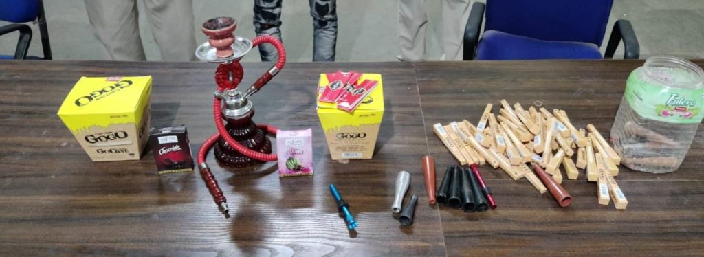 दिनांक 03.03.2022 को श्रीमान पुलिस अधीक्षक महोदय राजनांदगॉव श्री संतोष सिंह के निर्देशन एवं श्रीमान अतिरिक्त पुलिस अधीक्षक राजनांदगाव श्री संजय महादेवा एवं पुलिस अनुविभागीय अधिकारी खैरागढ़ श्री दिनेश सिन्हा के मार्गदर्शन पर घुमका व दुर्ग जिले के सीमा मे स्थित मोहंदी चौक के शीतल ढाबा जिसमे पान ठेला की आड़ मे अवैध रूप से संचालित तम्बाकू युक्त हुक्का पिलाने के लिए ग्राहकों व राहगीरो को हुक्का पॉट व अवैध फ्लेवर युक्त हुक्का व सामग्री उपलब्ध कराता है ममुखबिर की सुचना पर कार्यवाही हेतु थाना प्रभारी शशिकांत सिन्हा एवं थाना स्टाफ द्वारा सूचना पर टीम गठित कर मोंहदी चौक में शीतल ढाबा के बाजू में स्थित जनरल स्टोर पान ठेला पर छापामार कार्यवाही की गई जहॉ संचालक योगेश साहू पिता सुरेन्द्र साहू उम्र 21 साल साकिन मोंहदी थाना घुमका जिला राजनांदगांव के द्वारा लडको को प्रतिबंधित फ्लेवर का तम्बाकू, हुक्का पॉट उपलब्ध करा रहा था बिना अनुमति के बाद भी जनरल स्टोर की आड़ में हुक्का बार का संचालन किया जा रहा था मौके पर एक लाल रंग कॉच का हुक्का पॉट,काले रंग का चिलम, एक भुरा व काला रंग का पाईप एवं मिस चीफ, चॉकलेटी फ्लेवर का तम्बाकू जप्त किया गया एवं संचालक योगेश साहू के खिलाफ कोटपा एक्ट की धारा 4/21, 6/24 कोटपा अधि0 2003 के अंतगर्त कार्यवाही की गई।