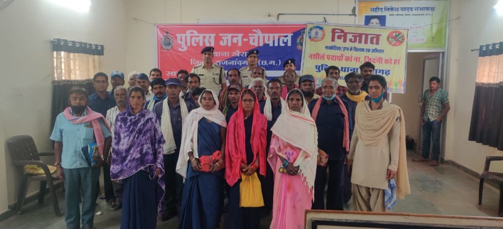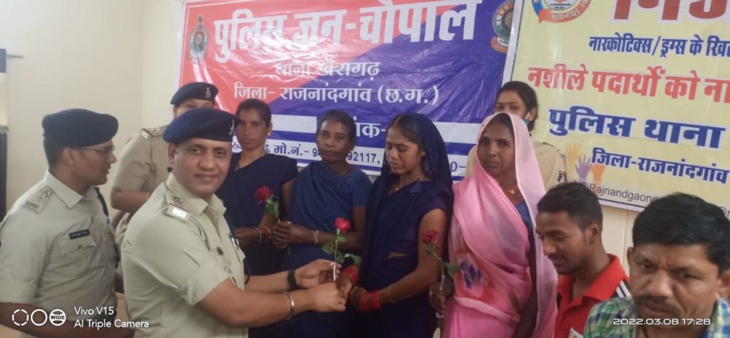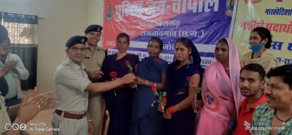 दिनांक 08/ 3 /2022 को थाना खैरागढ़ पुलिस द्वारा श्रीमान पुलिस अधीक्षक महोदय राजनांदगांव के निर्देशन एवं श्रीमान अतिरिक्त पुलिस अधीक्षक राजनांदगांव के मार्गदर्शन में पुलिस अनुविभागीय अधिकारी खैरागढ़ एवम थाना प्रभारी खैरागढ़ के द्वारा थाना खैरागढ़ में इलाका हाजा के ग्राम कोटवारों का पुलिस जन चौपाल एवम ”निजात अभियान ” के तहत मीटिंग लेकर एसडीओपी एवम थानाप्रभारी द्वारा आने वाले होली पर्व एवम विधानसभा उपचुनाव को शांतिपूर्ण तरीके से पूर्ण करने हेतु किन किन बातों को ध्यान रखना है के संबंध में विस्तार से जानकारी दी गई, तथा निजात अभियान के तहत सभी कोटवारों को अपने अपने क्षेत्रों में नशीली दवा ,गांजा विक्रेताओं पर नज़र रखने हेतु समझाइस दिया गया ।साथ ही महिला दिवस के अवसर पर महिला कोटवारों का सम्मानित किया गया।