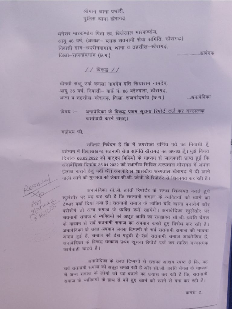 खैरागढ़ शिव मंदिर निवासी महिला संजू नामदेव द्वारा दिनांक 25-1-2022 को खैरागढ़ सिविल हॉस्पिटल में खाने की गुणवत्ता को लेकर प्रेस के सामने स्टेटमेंट दिया गया था जिसमें महिला द्वारा सतनामी समाज के बारे में अभद्रता पूर्वक शब्दों का उपयोग किया गया था।